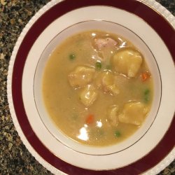 3Remove chicken from pot, shred it, and return to pot. Add peas and cook only 5 minutes longer.
