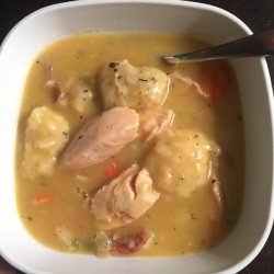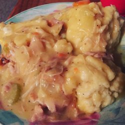 4Add dumplings. To make dumplings: Mix baking mix and milk until a soft dough forms. Drop by tablespoonfuls onto BOILING stew. Simmer covered for 10 minutes, then uncover and simmer an additional 10 minutes.
