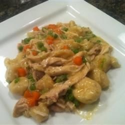1In a large pot over high heat, combine the chicken with enough water to cover, and boil for 15 to 20 minutes. Drain some of the water from the pot, reserving 3 cups in the pot. Remove chicken and allow it to cool, then pull it apart into bite size pieces; return to pot.