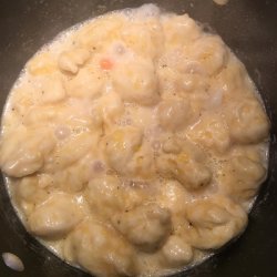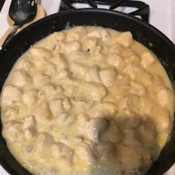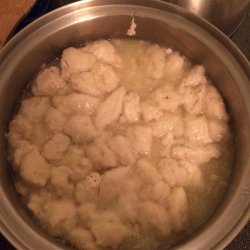 2Reduce heat to medium, and add the cans of condensed soup. Season with salt and pepper. Pull the biscuit dough into pieces, and add to the soup. Simmer over medium heat for 7 to 8 minutes, or until the dough is cooked through.