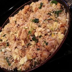 2When the chicken is cooked, add the rice, sugar, fish sauce, and soy sauce. Cook over medium heat, stirring gently. When the mixture is well blended, stir in the green onions, basil, and cilantro. Cook for 1 more minute, then serve hot.