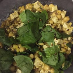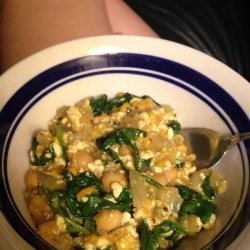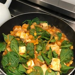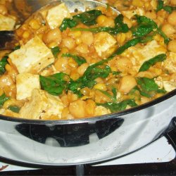 "A quick delicious Indian-style curry with spinach, chickpeas, onions, and/or whatever veggies you have. I have added cauliflower, potatoes, and sweet potatoes to this recipe in the past. All were very good. Serve with nan, pita or rice if desired."