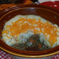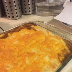 6Spread the vegetarian meat substitute mixture into the bottom of the baking dish, and top with the mashed potatoes, smoothing them into an even layer. Sprinkle the potatoes with the shredded soy cheese.