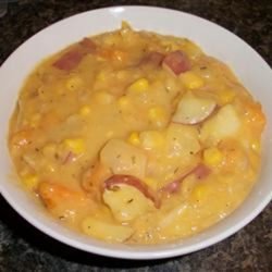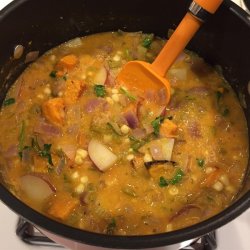 5Once the potato is tender, remove and discard the bay leaf. Stir in the whole corn kernels, sweet potato, and chopped parsley. Return to a simmer and season to taste with salt and pepper before serving.