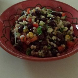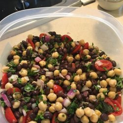 1In a salad bowl, lightly mix together the garbanzo beans, black beans, mint, parsley, onion, and grape tomatoes.