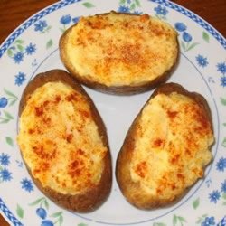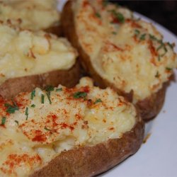 4Remove potatoes from oven and slice skin off of the top. Scoop the flesh into a large bowl, reserving the intact skins. To the potatoes add cheese, egg, butter and half of the green onions. Mash potatoes while gradually adding milk. Spoon the mixture into the skins and top with remaining onions and paprika.