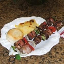 "Here's a delicious way to prepare elk: seasoned pieces of backstrap are wrapped in bacon, and grilled. This tasty meal is ready in under half an hour! I like to sprinkle the skewers with more Worcestershire sauce halfway through cooking."