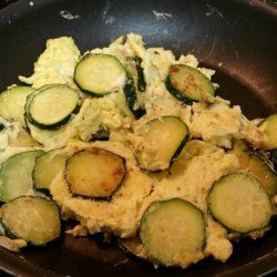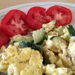 2Heat the olive oil in a large skillet over medium-high heat; cook the zucchini in the hot oil until softened and lightly browned, about 7 minutes. Season the zucchini with garlic powder, salt, and pepper. Reduce heat to medium; pour the egg mixture into the skillet. Cook, stirring gently, for about 3 minutes. Remove the skillet from the heat and cover. Keep covered off the heat until the eggs set, about 2 minutes more.