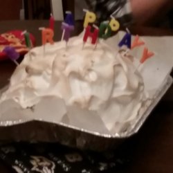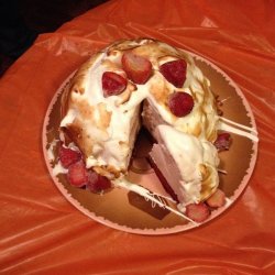 6Line a baking sheet with parchment or heavy brown paper. Place cake in center. Turn molded ice cream out onto cake. Quickly and prettily spread meringue over cake and ice cream, all the way to paper to seal. Return to freezer 2 hours.