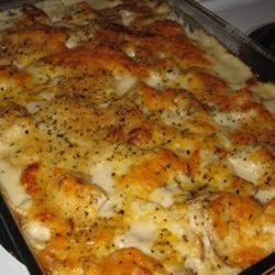 2Lightly grease a 9x13 inch baking dish. In a medium bowl, whisk together the Alfredo sauce and milk. Spread 1/4 cup of the sauce in the bottom of the baking dish. Then layer 1/3 of the potatoes over the sauce in the dish. Sprinkle with 1 tablespoon of Parmesan cheese and salt and pepper to taste.