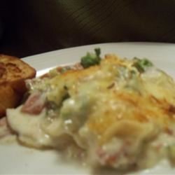3In a separate medium bowl, combine the ham, broccoli and 1 1/2 cups of the Swiss cheese. Mix well and spread 1/3 of this mixture over the potatoes in the baking dish. Then top with another layer of potatoes, followed by the ham mixture, finally topping all with the remaining Swiss cheese and Parmesan cheese. Pour the remaining Alfredo sauce over all.