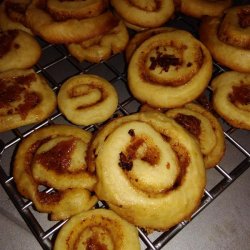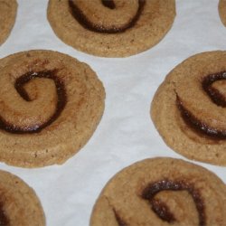 3On a lightly floured surface, roll out each half of the dough to a 12x6 inch rectangle. Spread 1/3 of the cinnamon mixture over each rectangle. Roll each one lengthwise into a log. Cut into 1 inch segments. Use remaining filling to place a small dollop of the mixture onto the cookie sheet where each cookie will be placed, About every 3 inches. Place 1 cookie onto each dollop with the cut side down.