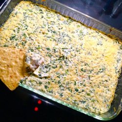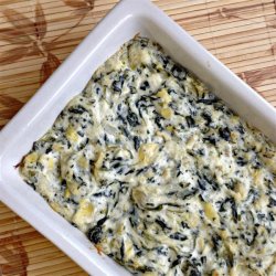2In a medium bowl, mix together the cream cheese and mayonnaise until smooth. Mix in the artichoke hearts, spinach and Parmesan cheese. Season with garlic and lemon juice. Spread evenly into the prepared baking dish.