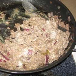 2Place the sliced beef in the pan, and fry until no longer pink, about 5 minutes. Reduce heat to low, and stir in the cream cheese and Worcestershire sauce, cooking and stirring until the beef is well coated. Season with salt and pepper to taste.