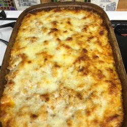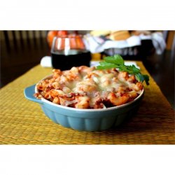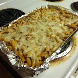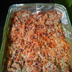 3Add spaghetti sauce and rotini pasta to browned beef. In a three quart casserole dish layer meat mixture, followed with the mozzarella cheese, repeat.