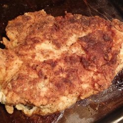 3Heat the vegetable oil in a skillet over medium-high heat. Dredge the chicken breasts in flour again, and shake off excess. Brown the chicken in the hot oil until golden brown on both sides. Place onto a baking sheet, and bake in preheated oven until the chicken is no longer pink in the center, 20 to 30 minutes.