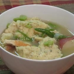 2In a large pot, bring 4 cups chicken broth to a boil. Drop dumpling mixture by rounded spoonfuls into boiling broth. Simmer, uncovered, 5 to 8 minutes, until well formed and slightly browned. Remove with a slotted spoon and drain on paper towels. Reserve dumpling cooking liquid.