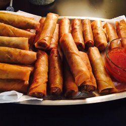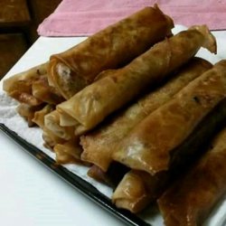 2Place three heaping tablespoons of the filling diagonally near one corner of each wrapper, leaving a 1 1/2 inch space at both ends. Fold the side along the length of the filling over the filling, tuck in both ends, and roll neatly. Keep the roll tight as you assemble. Moisten the other side of the wrapper with water to seal the edge. Cover the rolls with plastic wrap to retain moisture.