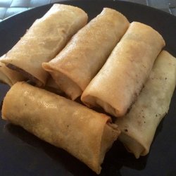 3Heat a heavy skillet over medium heat, add oil to 1/2 inch depth, and heat for 5 minutes. Slide 3 or 4 lumpia into the oil. Fry the rolls for 1 to 2 minutes, until all sides are golden brown. Drain on paper towels. Serve immediately.