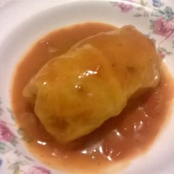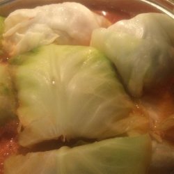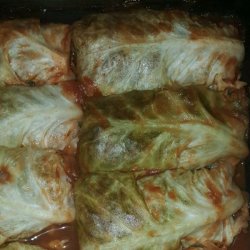 2In a separate large bowl, combine the beef, rice, garlic powder and the egg, mixing well. Place a small amount, about the size of your palm, into the center of a cabbage leaf and fold leaf over, tucking in the sides of the leaf to keep meat mixture inside.