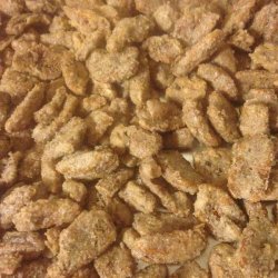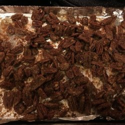 3Whisk egg white and water together in a separate bowl until frothy. Toss pecans in the egg white mixture. Mix sugar mixture into pecan mixture until pecans are evenly coated. Spread coated pecans onto a baking sheet.