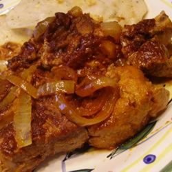2Place the pork ribs in a saucepan with a lid, and pour the sauce over the ribs. Spread raw onion rings over the ribs, and cover the pan. Bring to a boil over medium heat, and simmer the ribs in the sauce for 45 minutes, or until tender.