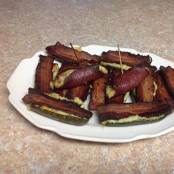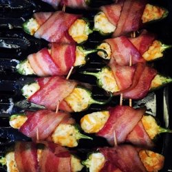 2Stir together the cream cheese, Cheddar cheese, mayonnaise, ranch dressing mix, and garlic powder in a mixing bowl until evenly blended. Spoon some of the cheese mixture into each jalapeno half, wrap with half a bacon strip, and secure with a toothpick. Arrange the wrapped jalapeno halves onto a broiler pan.
