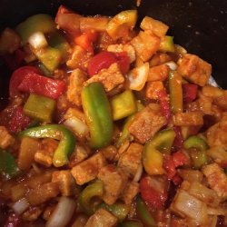 Place onion, red bell pepper, green bell pepper, and chicken tenders in the bottom of the crock pot.