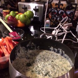 "This is my spin on a popular creamy cheese fondue. Have fun with it and incorporate the cheeses and veggies you like. Serve with veggies and bread sticks."