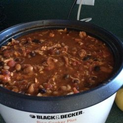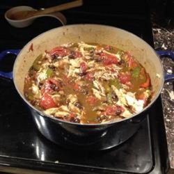 3Stir black beans, stewed tomatoes, and chicken meat together in a separate pot over medium-low heat; bring to a low simmer. Stir the vegetable-broth mixture into the black bean mixture. Bring again to a simmer and cook, adding water as needed to keep the mixture from becoming too dry, until the flavors blend, at least 30 minutes.
