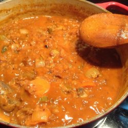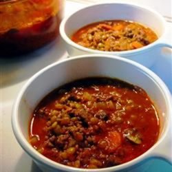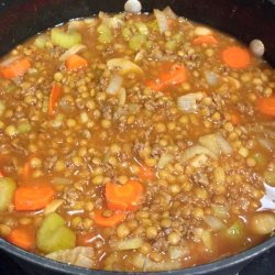 2Place meat in a big pot with lid. Add lentils, vegetables, water, salt, pepper, bouillon, vegetable juice, mushrooms, and Worcestershire sauce. Cook on high until it boils. Reduce heat to low, and cover. Simmer for about 1 1/2 to 2 hours, or until lentils are tender. Stir occasionally.