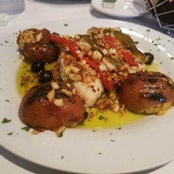 "Portuguese recipe for baked cod with potatoes, tomatoes and lots of olive oil. You need to soak the cod in water overnight to remove the salt. Serve hot."