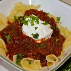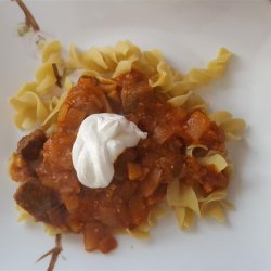 "This is a very rich and flavorful beef dish with a thick, red, smoky tasting sauce. Great for making a day ahead and reheating. Instead of noodles, you can serve over rice or potatoes."