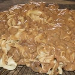 3Bring a large pot of lightly salted water to a boil. Add the egg noodles, and cook until al dente, 8 to 10 minutes; drain. Spoon the Stroganoff over the egg noodles to serve.