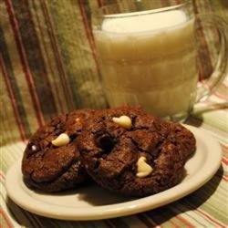 3Cream butter, white sugar, brown sugar, egg, vanilla and water in a mixing bowl until fluffy. Blend flour mixture into the egg mixture until mixed well. Stir white chocolate and chocolate chips into the dough. Drop tablespoon-size dough approximately 1 inch from each other on cookie sheet.