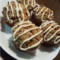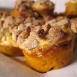 5Place pumpkin mixture in muffin cups about 1/2 full. Then add one tablespoon of the cream cheese mixture right in the middle of the batter. Try to keep cream cheese from touching the paper cup. Sprinkle on the streusel topping.