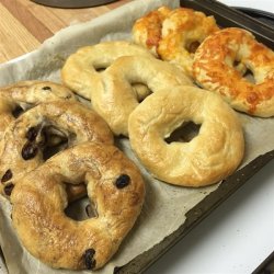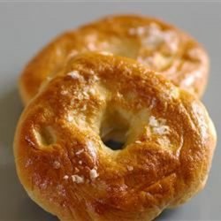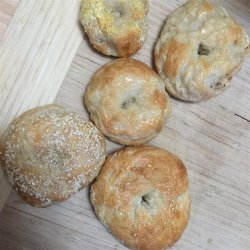 3Cut dough into 9 equal pieces, and roll each piece into a small ball. Flatten balls. Poke a hole in the middle of each with your thumb. Twirl the dough on your finger or thumb to enlarge the hole, and to even out the dough around the hole. Cover bagels with a clean cloth, and let rest for 10 minutes.