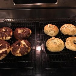 4Sprinkle an ungreased baking sheet with cornmeal. Carefully transfer bagels to boiling water. Boil for 1 minute, turning half way through. Drain briefly on clean towel. Arrange boiled bagels on baking sheet. Glaze tops with egg white, and sprinkle with your choice of toppings.