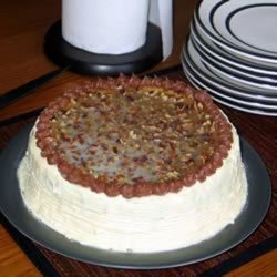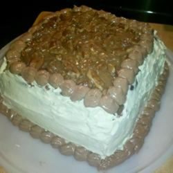 4To make pralines: combine butter and brown sugar in small saucepan. Heat on medium to medium high, stirring constantly. Bring to boil for 2 minutes, again stirring constantly. Pour in pecans and remove from heat. Stir, then immediately pour pralines over cake. Cool cake in refrigerator.