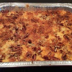 2In the prepared dish, layer the cherry pie filling and the drained pineapple. Sprinkle the dry cake mix over the top, covering evenly. Pour the melted margarine over the cake mix, and sprinkle the top with the coconut and chopped walnuts.
