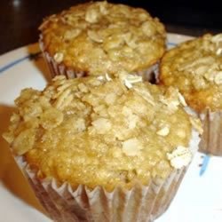4To make Topping: In a small bowl, combine 1/3 cup rolled oats, brown sugar, cinnamon. Cut in butter until mixture resembles coarse crumbs; stir in 1/4 cup chopped walnuts. Generously sprinkle muffins with topping.