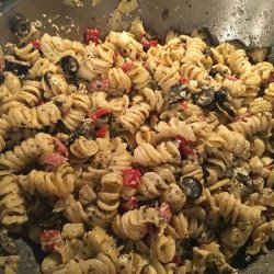 3Mix fusilli, basil, salami, pepperoni, artichoke hearts, provolone cheese, Asiago cheese, olives, roasted red peppers, 1/2 teaspoon black pepper, and 1/4 teaspoon salt in a large bowl; drizzle vinaigrette over salad. Toss to evenly coat.