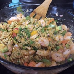 3Toss cooked pasta, shrimp, tomatoes, green onions, red onion, green, red, yellow, and orange bell peppers, and cilantro in a large salad bowl until thoroughly combined.