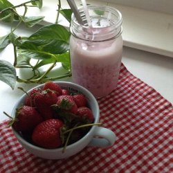 In a blender, combine milk, honey, vanilla and frozen strawberries. Blend until smooth. Pour into glasses and serve.
