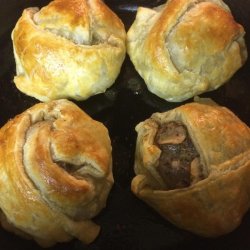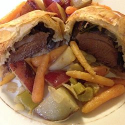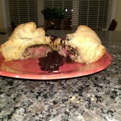 2Partially thaw the puff pastry sheets and roll out pieces thin enough to cover the top, sides and bottom of each steak. Place the steaks on a baking sheet, cover with plastic wrap and store in the refrigerator until serving time.