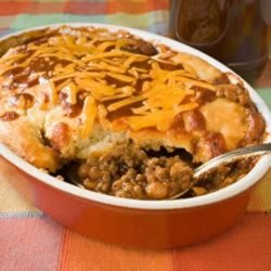 4Bake for 40 to 45 minutes in the preheated oven, until the biscuit toping is golden brown. Spread a small amount of barbeque sauce over the top and sprinkle with Cheddar cheese while hot from the oven.