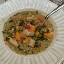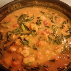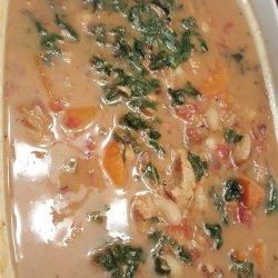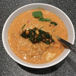 "A hearty stew that's super-easy to make and great for peanut butter lovers. Can be made vegetarian or with chicken. In a pinch, feel free to use vegetable or corn oil for peanut oil, powdered ginger for fresh, water for stock, etc. Kale works well in place of collard greens."