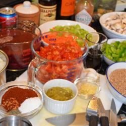1Heat the olive oil in a large pot over high heat. Stir in the onion, celery, green bell pepper, carrot, garlic, mushrooms, red pepper flakes, cumin, chili powder, basil, salt, and pepper. Cook and stir until the vegetables begin to soften, about 2 minutes. Stir in the tomato juice, bulgur wheat, chopped tomatoes, kidney beans, hot pepper sauce, lemon juice, tomato paste, Worcestershire sauce, red wine, and green chile peppers. Bring to a boil, stirring frequently. Reduce heat to medium-low, and simmer, uncovered, 20 minutes before serving.