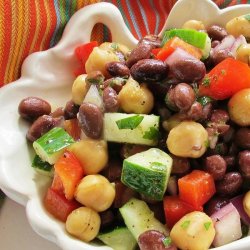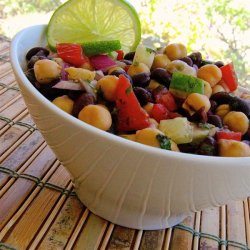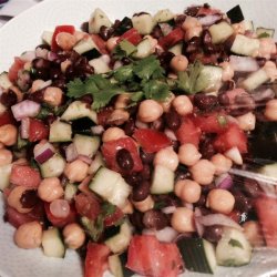 1Whisk together cilantro, lime juice, lime zest, and olive oil in a bowl; season with black pepper and salt. Mix together black beans, garbanzo beans, tomato, cucumber, and red onion in a salad bowl. Drizzle dressing over salad and toss to coat.