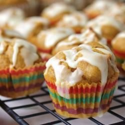 4Divide batter among the muffin cups and bake until golden and cooked through, about 10 minutes. Let stand a few minutes, then transfer mini-muffins to a wire rack to cool. Mix the drizzle ingredients together and drizzle over warm muffins.